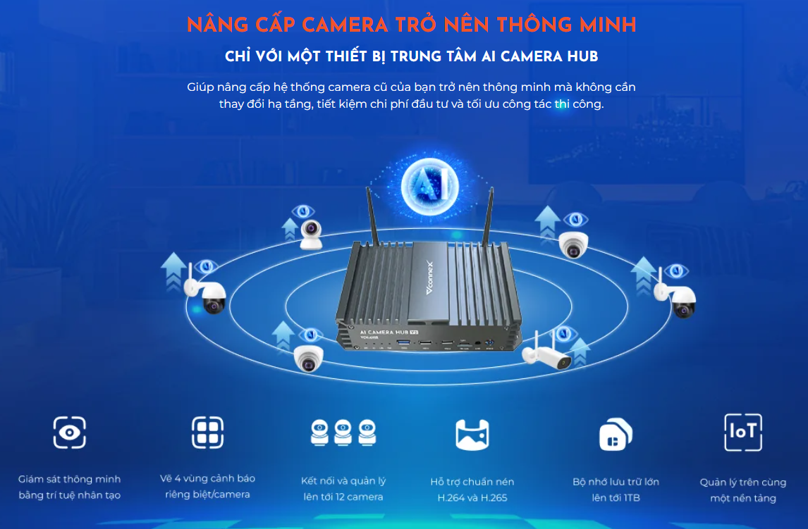 AI Camera Hub Pro cho phép kết nối và quản lý nhiều camera về một hệ thống; nâng cấp các thiết bị camera thông thường trở nên thông minh hơn, nhờ tích hợp các tính năng AI. Giúp nâng cao hệ thống giám sát an ninh linh hoạt cả với hộ gia đình đơn lẻ và môi trường công cộng, hỗ trợ bảo vệ tài sản và giảm thiểu các rủi ro ảnh hưởng tới sức khỏe con người.