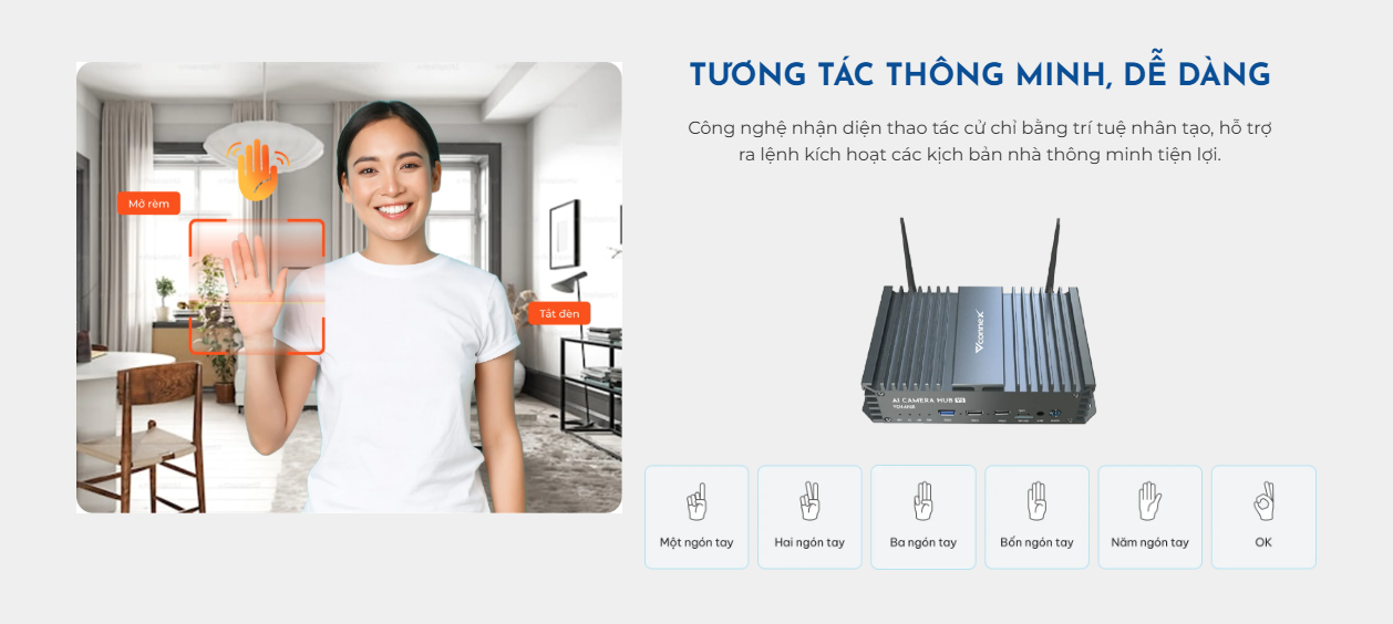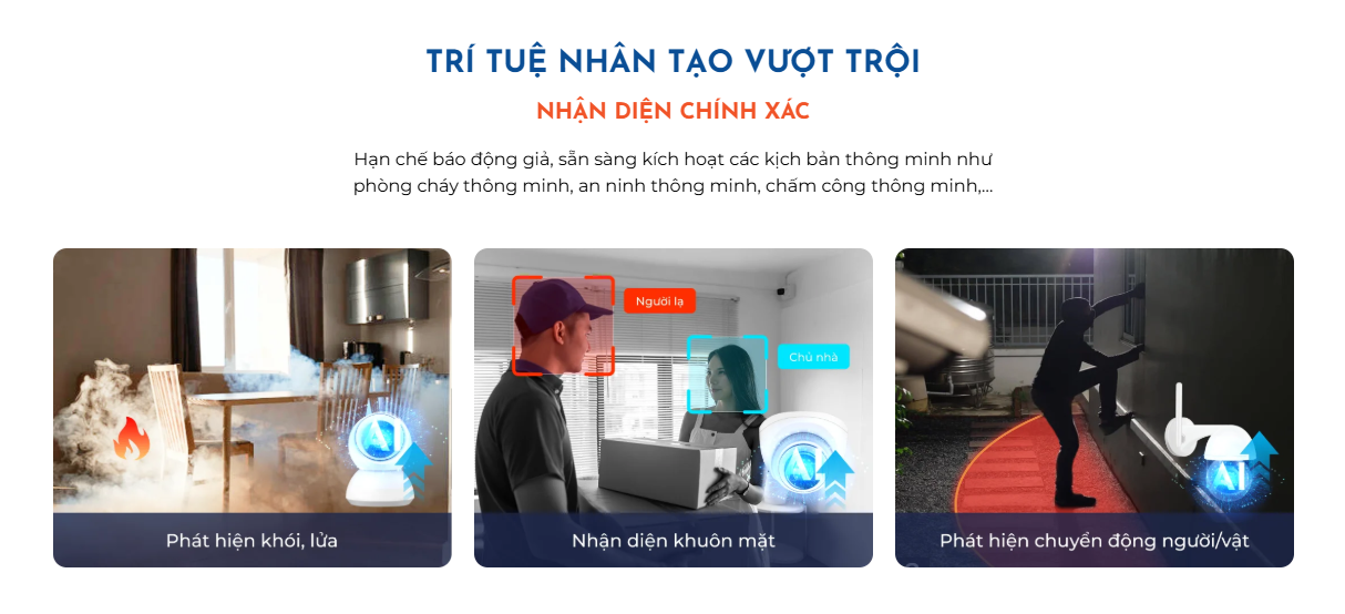 - Công nghệ AI: Phát hiện chuyển động, phát hiện người, khuôn mặt, cử chỉ (6 cử chỉ), phát hiện lửa.