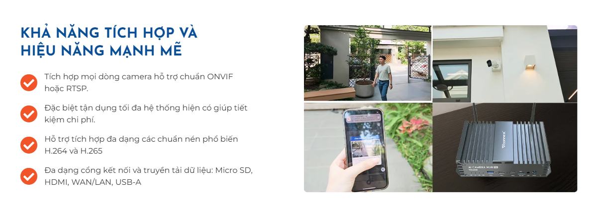 - Hỗ trợ camera: Kết nối và quản lý 12 camera, tích hợp tất cả dòng camera hỗ trợ ONVIF hoặc RTSP