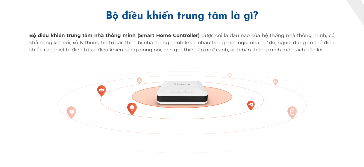 Bộ điều khiển trung tâm nhà thông minh (Smart Home Controller) được coi là đầu não của hệ thống nhà thông minh, có khả năng kết nối, xử lý thông tin từ các thiết bị nhà thông minh khác nhau trong một ngôi nhà. Từ đó, người dùng có thể điều khiển các thiết bị điện từ xa, điều khiển bằng giọng nói, hẹn giờ, thiết lập ngữ cảnh, kịch bản thông minh một cách tiện lợi.