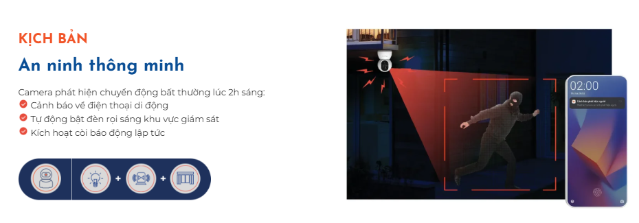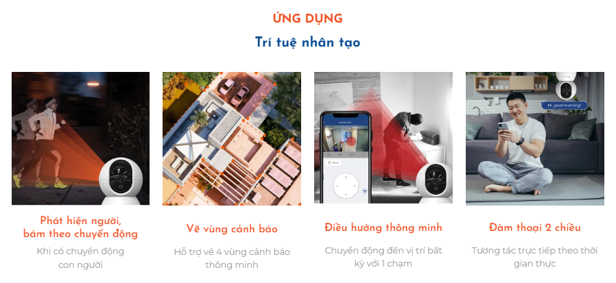 - Tính năng AI: Phân tích phát hiện người, phát hiện chuyển động, tự động bám theo và ghi hình, kích hoạt cảnh báo an ninh thông minh, đàm thoại 2 chiều.