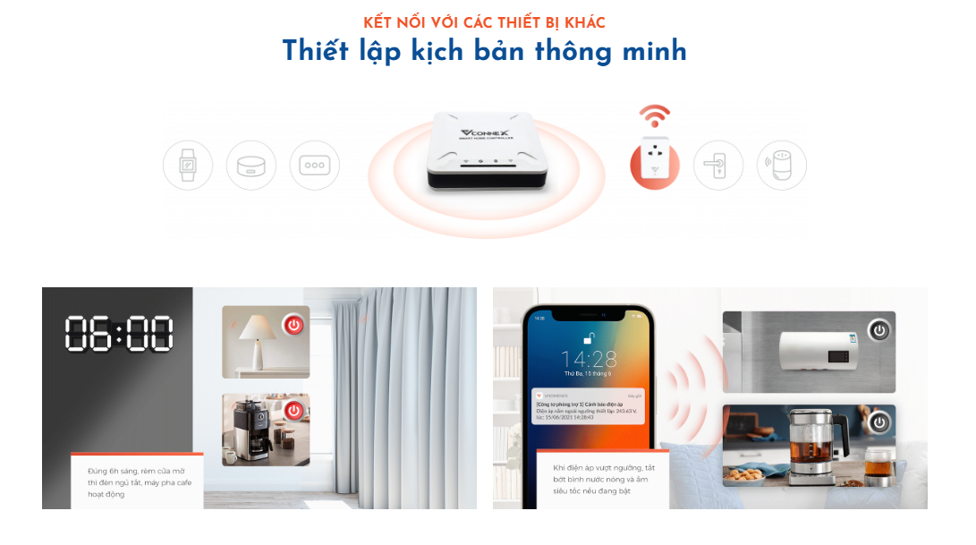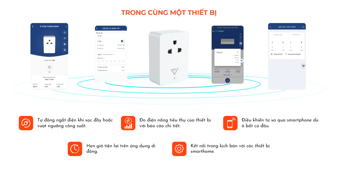 Ổ cắm đo điện năng thông minh của Vconnex giúp giám sát mức tiêu thụ điện của các thiết bị trong gia đình, với báo cáo chi tiết theo ngày/tháng. Ngoài ra có thể điều khiển các thiết bị điện từ xa, hẹn giờ tự động và hỗ trợ ra lệnh giọng nói khi kết hợp loa thông minh.