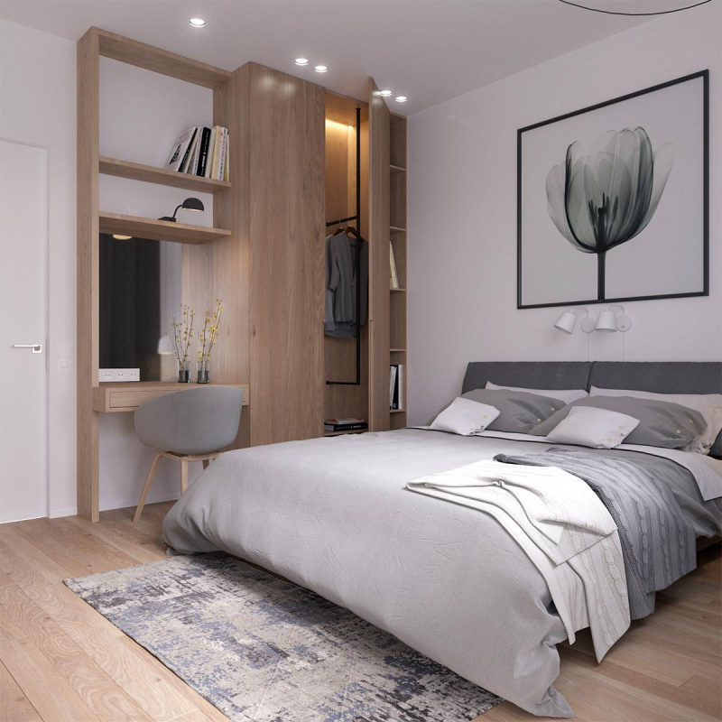 Bố trí: downlight nền + đèn ngủ/đèn hắt đầu giường; tối thì dim xuống.