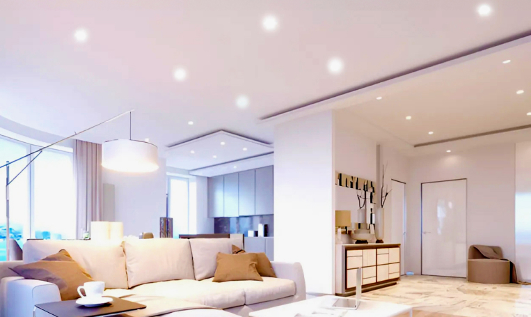 Phòng khách liền bếp là “đặc sản” căn hộ/nhà phố. Ban ngày bạn cần ánh sáng rõ để nấu ăn/dọn dẹp; buổi tối lại muốn ánh sáng ấm để thư giãn. Một bộ đèn downlight âm trần đổi nhiệt độ màu cho phép bạn chuyển nhanh: