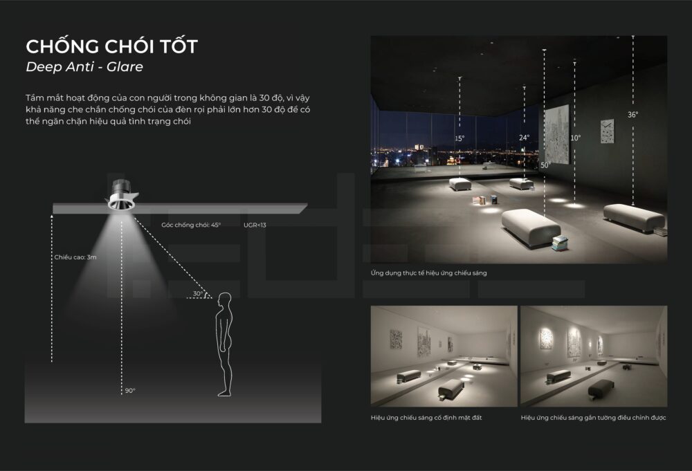 Đèn âm trần chống chói phân bố ánh sáng rộng nhưng dịu, giảm vùng sáng tối khác biệt, tạo cảm giác thoải mái và sang trọng.