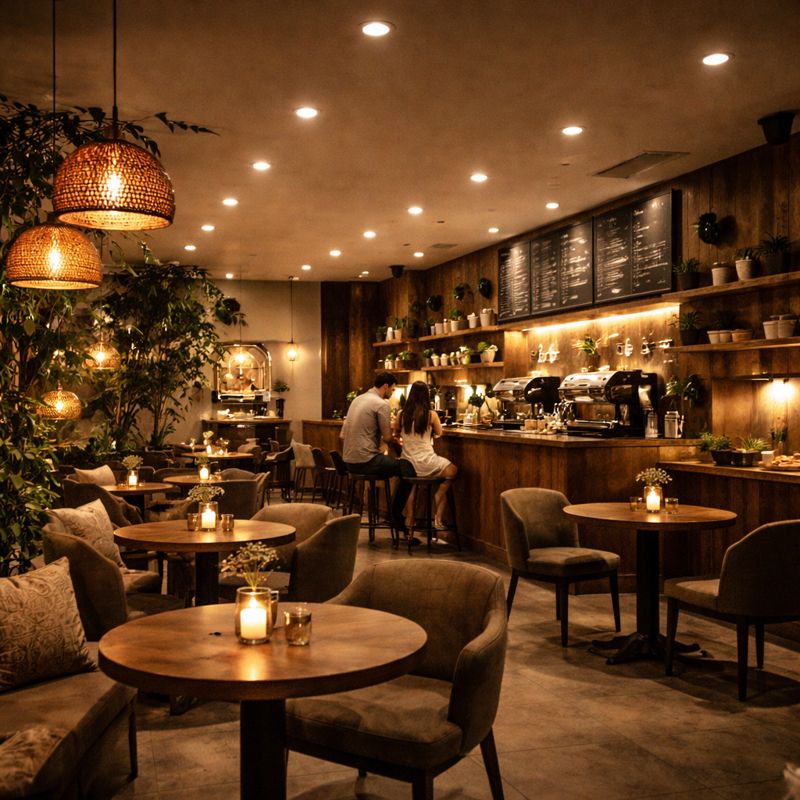 Đây là những không gian đòi hỏi tính thẩm mỹ và không khí. Đèn âm trần dimmable cho phép chủ quán thay đổi độ sáng theo khung giờ hoặc sự kiện.