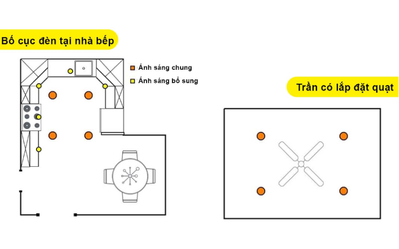 Bếp: chiếu chung + đèn tập trung cho bàn bếp (đừng “đánh đồng” tất cả bằng một loại).