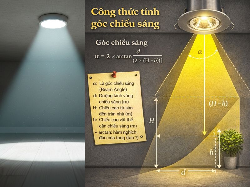 Dựa vào chiều cao trần + beam angle để ra nhịp đèn. Nguồn hướng dẫn spacing cũng nhấn mạnh beam angle quyết định “vùng phủ” sáng.
