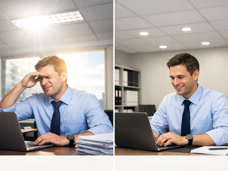 Sai lầm: Thấy đèn “lún trần đẹp” là mua, không kiểm tra thiết kế anti-glare (nguồn sáng có sâu không, có baffle/reflector chống chói không).