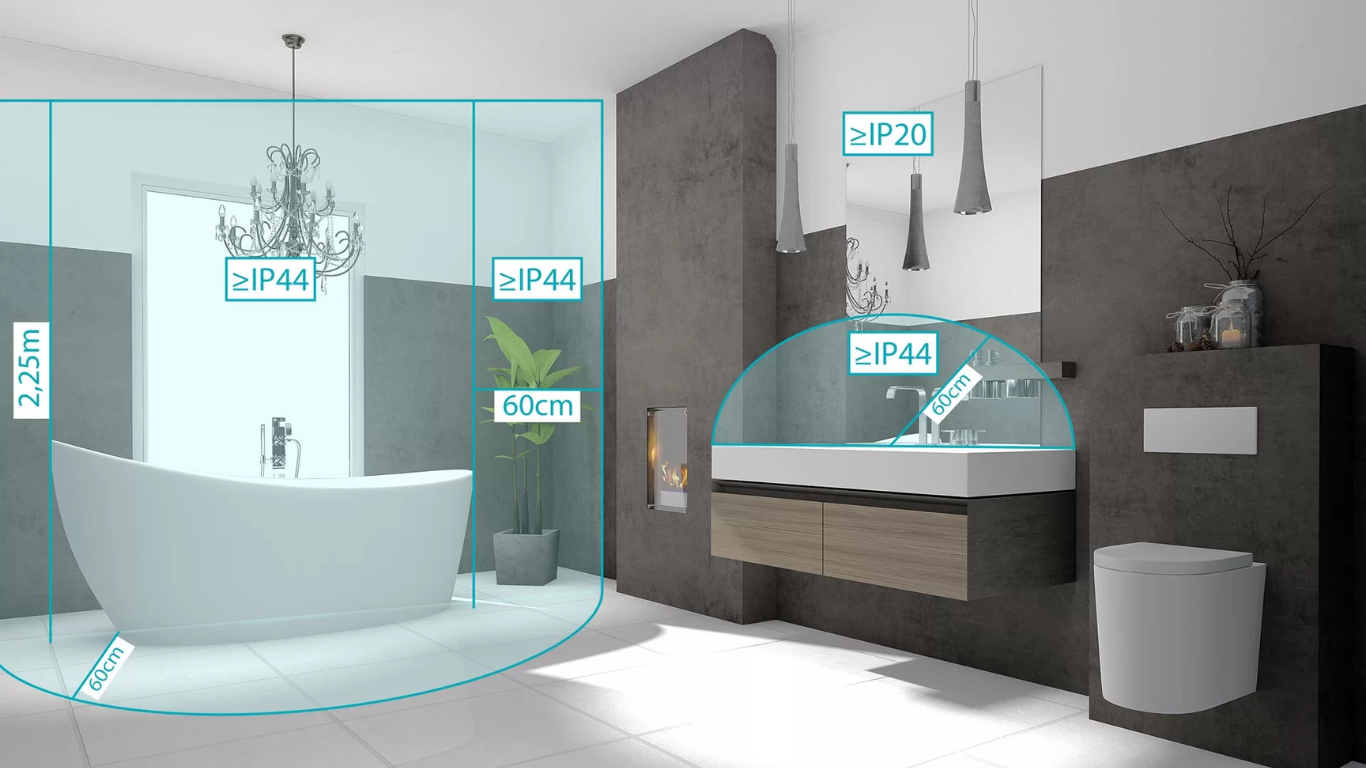 Thực tế bố trí theo “zone” nhà tắm: Các hướng dẫn an toàn nhà tắm thường phân zone và khuyến nghị IP tối thiểu cao hơn cho vùng gần vòi sen/bồn tắm (thường gặp IP44, IP65…).